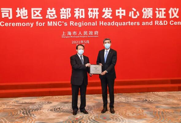 芬林集團亞太區總裁宋望球(右)代表企業接受上海市市長龔正頒予的地區總部證書