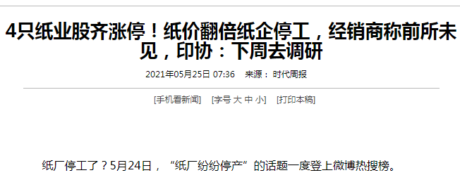 紙廠停工了?5月24日,“紙廠紛紛停產(chǎn)”的話題一度登上微博熱搜榜。據(jù)央視財(cái)經(jīng)報(bào)道,紙廠停工的原因與紙價(jià)上漲有一定關(guān)系,進(jìn)入五月份以來(lái),國(guó)內(nèi)文化紙企業(yè)和貿(mào)易商發(fā)布多張漲價(jià)函,其中文化紙普遍漲價(jià)200元/噸,白卡紙漲價(jià)則達(dá)到1000元/噸。