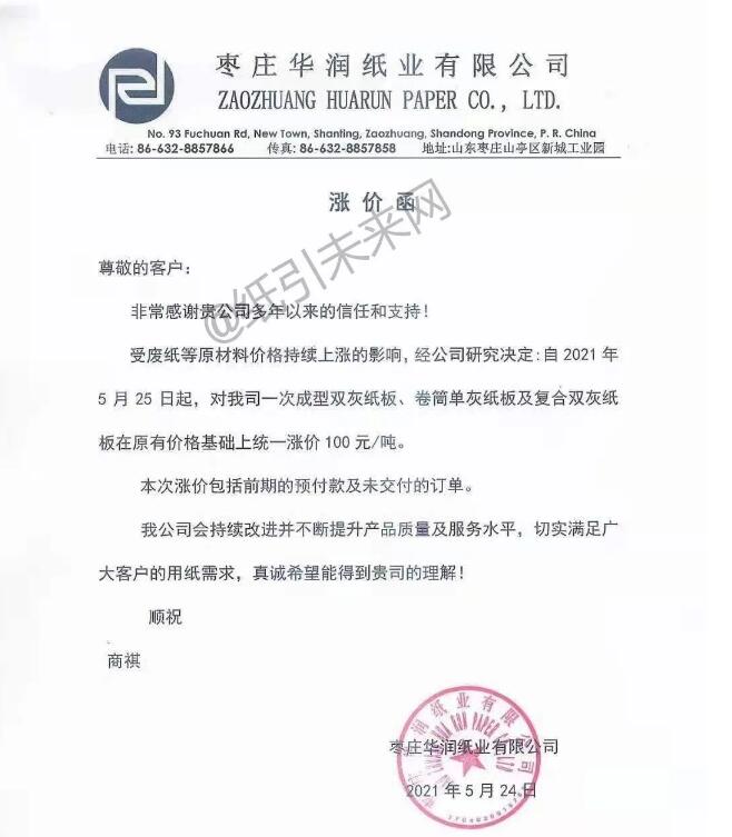 棗莊華潤紙業有限公司:受廢紙等原材料價格持續上漲的影響,經公司研究決定∶自2021年5月25日起,對我司—次成型雙灰紙板、卷筒單灰紙板及復合雙灰紙板在原有價格基礎上統——漲價100元/噸。