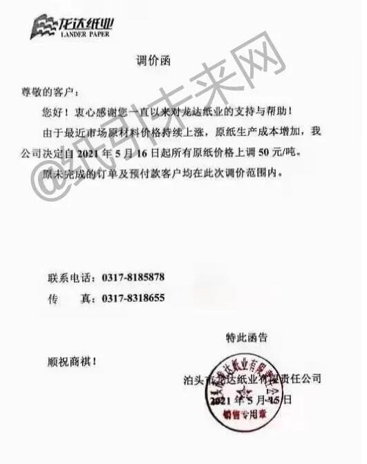 泊頭市龍達紙業有限責任公司:由于最近市場原材料價格持續上漲,原紙生產成本增加,我公司決定自2021年5月16日起所有原紙價格上調50元/噸。