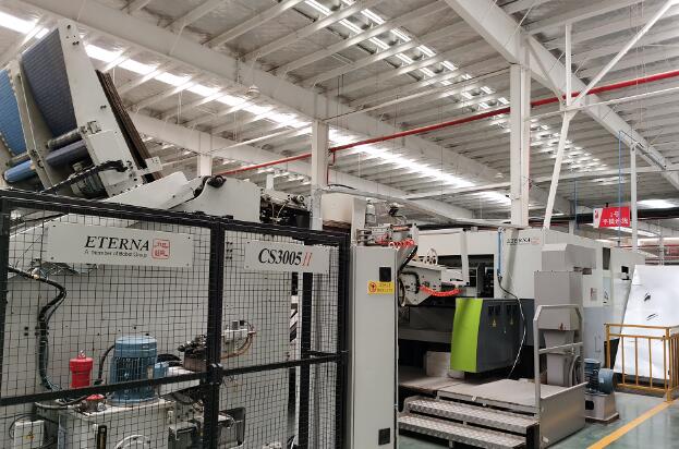 緊接著,現場嘉賓在工作人員的帶領下,來到湖北合興智能包裝科技有限公司大數據分析辦公室,并參觀了紙箱成型車間和成品車間。只見成型車間內兩條京山輕機1.8米頂配的瓦楞紙板線、數臺配備全自動上料機的上海旭恒平壓平模切機以及眾多先進的糊箱、打包等設備全力生產,趕制訂單。