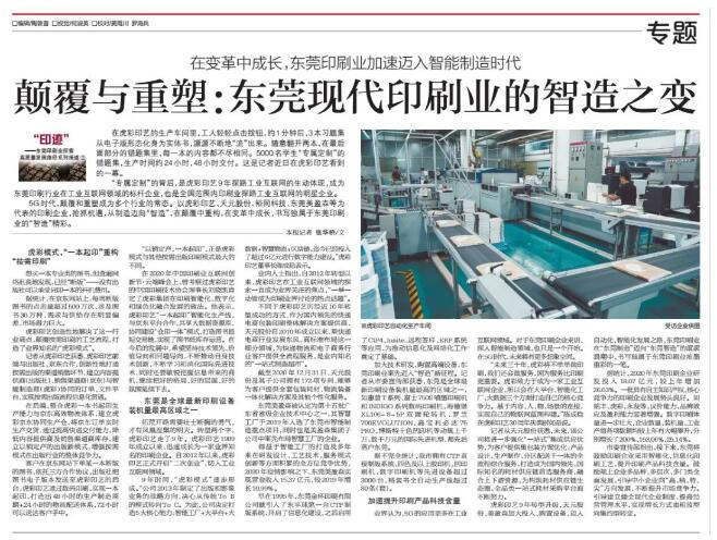 東莞美盈森被認定為第十五批廣東省省級企業技術中心之一,其智慧工廠于2019年入選了東莞市智能制造重點項目,同時也是美盈森集團子公司中率先布局智慧工廠的企業。 得益于智能工廠的打造及多年來在研發設計、工藝技術、服務模式創新等方面積累的全方位競爭優勢,2020年疫情影響之下,東莞美盈森實現營業收入15.37億元,較2019年增長10.99%。 早在1995年,東莞金杯印刷有限公司就引入了東半球第一臺CTP制版系統,開啟了信息化建設,之后啟用了CIP4、Insite、遠程簽樣、ERP系統等應用,為推動信息化及網絡化工作奠定了基礎。 加大技術研發,購置高端設備,東莞印刷業率先邁入“智造”新征程。記者從市委宣傳部獲悉,東莞是全球最新印刷設備裝機量最高的區域之一,如惠普T系列、富士750S噴墨印刷機和INDIGO系列數碼印刷機,海德堡XL106-8-5P雙面輪轉機、羅蘭700EVOLUTION、高寶利必達75PRO、博斯特十色凹印機等動輒上千萬、數千萬元的國際先進機型,都先后落戶東莞。 據不完全統計,我市擁有CTP直接制版系統、四色及以上膠印機、凹印刷機、數字印刷機等先進設備超過3000臺,精裝書全自動生產線超過80條(套)。