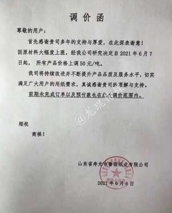 山東省壽光市魯麗紙業有限公司 從2021年6月7日起,所有產品價格上漲50元/噸。