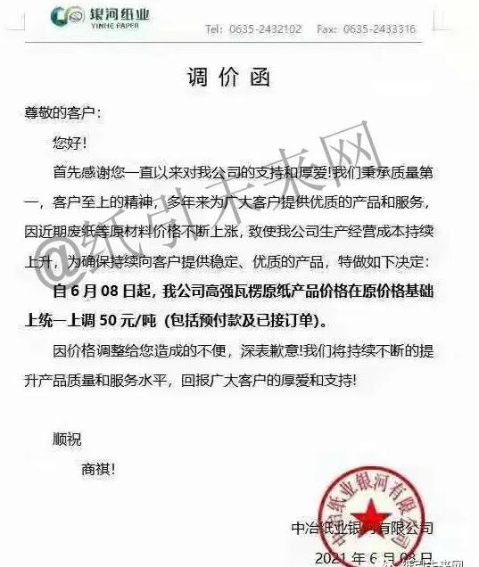 柏鄉縣錦寶石新材料開發有限公司:從2021年6月7日早上八點起,在目前高瓦、箱板銷售價格的基礎上上漲50元/噸(包括預付款及已接訂單)。