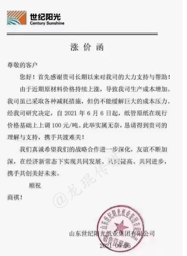 山東世紀陽光紙業集團有限公司:從2021年6月6日起,紙管原紙在現行價格基礎上上漲100元/噸。