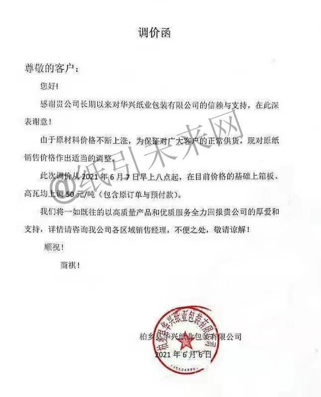 柏鄉縣華興紙業包裝有限公司:由于原材料價格不斷上漲,為保證對廣大客戶的正常供貨,現對原紙銷售價格作出適當的調整。此次調價從2021年6月7日早上八點起,在目前價格的基礎上箱板、高瓦均上調50元/噸(包含原訂單與預付款)。