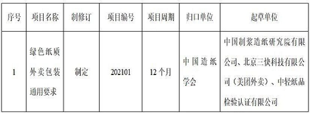 《綠色紙質(zhì)外賣包裝通用要求》團(tuán)體標(biāo)準(zhǔn)制定計(jì)劃項(xiàng)目表