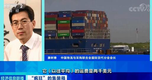 中國物流與采購聯合會國際貨代分會會長康樹春:從中國運到美國的一個集裝箱以往平均運費是2000美元。現在漲到2萬美元甚至更高,中間存在著10倍的利潤空間。即使說運回成本很高,去程運費利潤空間可以覆蓋它的空箱返程成本,所以現在都在想辦法把海外的空箱調回。