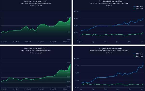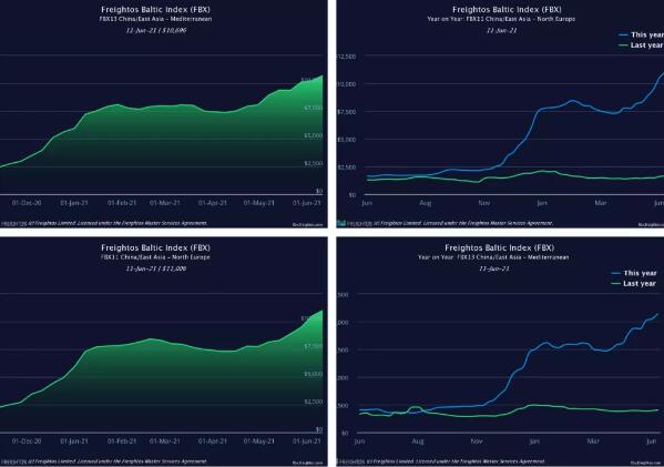 與此同時,跨太平洋航運公司將于6月15日起對亞洲至美國發貨人發起沖擊,針對每40英尺貨柜征收的GRI最高可達3000美元,一些航運公司目前至美國東海岸港口運價達到17000美元/40英尺。 跨大西洋托運人也感受到了利率上漲的影響,周環比大幅上漲:上周波羅的海運價指數(FBX)從北歐至美國部分上漲17%,至每40英尺5069美元。 上周亞洲至地中海的FBX指數進一步攀升4%,至每40英尺10696美元;亞洲至北歐的FBX指數進一步攀升5%,至每40英尺11006美元,但相關機構從上周觀測到英國實際交付的大部分承運人報價約為每40英尺16000美元。