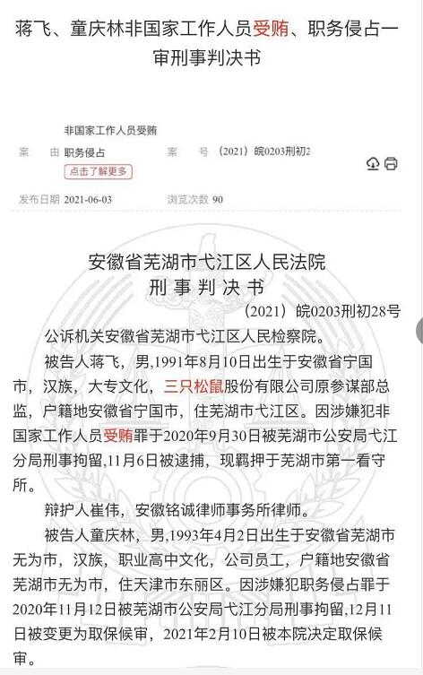 近日,據(jù)裁判文書網(wǎng)披露,三只松鼠物流部總參謀蔣某伙同員工童某某,犯非國家工作人員受賄罪與職務(wù)侵占罪,涉案金額累計(jì)達(dá)近140萬。