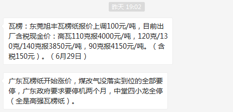 6月29日,一則朋友圈消息被瘋傳,消息稱:“東莞7月1號(hào)起所有造紙廠燒鍋爐的要停,原紙將大幅上漲。” 而隨后,東莞中小紙廠紛紛喊漲,各種漲價(jià)消息紛至沓來(lái)!