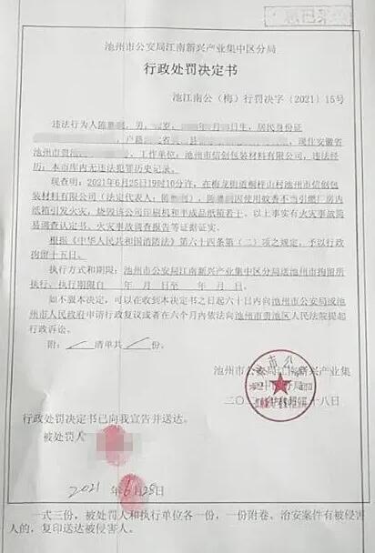 2021年6月25日20時59分,安徽省池州市消防救援支隊119指揮中心接到報警稱位于梅龍街道桐梓山村的池州市信創包裝材料有限公司發生火災。經公安、消防部門調查取證,該起火災是由于陳某使用蚊香不當引燃廠房內紙箱,隨后蔓延。其行為造成該公司印刷機和半成品紙箱若干被燒毀。