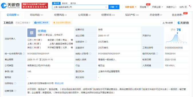 上海八融食品有限公司成立于2006年,注冊資本255萬美元,法定代表人蔡秉融。天眼查被執行人信息顯示,目前該公司累計被執行金額超337萬。此外,該公司還因有履行能力而拒不履行生效法律文書確定義務被上海市閔行區人民法院列為失信被執行人,且關聯多條限制消費令和法律訴訟,多數案件涉及勞動爭議和買賣合同糾紛。