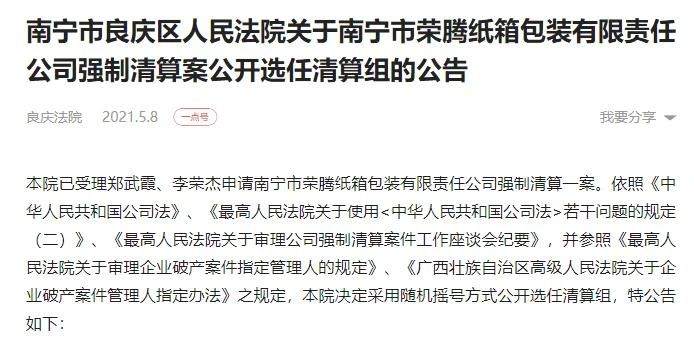 4月21日,河南華麗紙業(yè)包裝股份有限公司(下稱:河南華麗包裝)發(fā)布公告稱,旗下兩家子公司——新疆華麗包裝有限公司、湖北華麗包裝有限公司相關(guān)破產(chǎn)財產(chǎn)將于5月份公開拍賣。  5月7月,南寧市良慶區(qū)人民法院受理南寧市榮騰紙箱包裝有限責任公司強制清算一案。