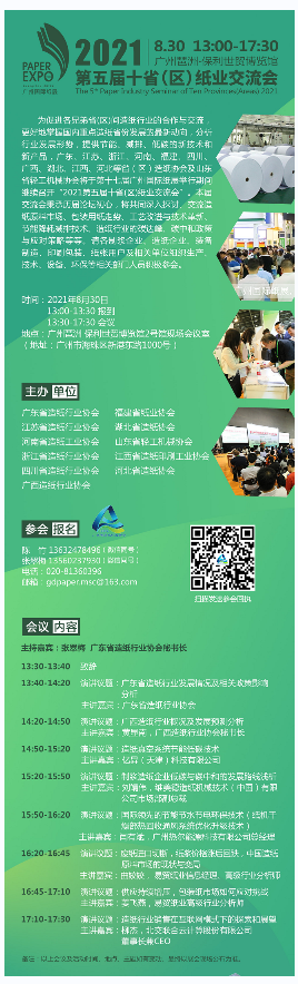 兩大論壇 觸摸行業新機遇 展會同期舉辦“2021第五屆十省(區)紙業交流會”及“2021以紙代塑產業發展論壇”。邀請行業專家、名師、企業高管、行業分析師等權威,就目前企業面臨和關注的問題,展開深入解讀和剖析,以期獲得新思考、新啟發。 ▌2021第五屆十省(區)紙業交流會 廣東、江蘇、浙江、河南、福建、四川、廣西、湖北、江西、河北等省(區)造紙協會及山東省輕工機械協會,攜手召開2021第五屆十省(區)紙業交流會,來看日程。