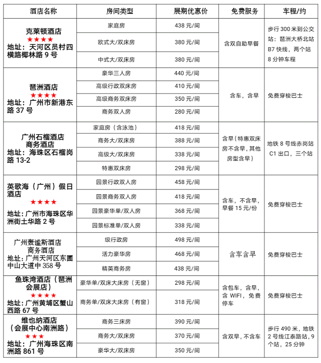 (掃碼預登記) ▌參展聯系: 聯系:張鴻經理 手機:13543488104 電話:020-83392687 ▌參觀參會聯系: 聯系:陳小琳經理 手機:15361765199(微信同號) 電話: ▌參會須知: 1、參觀參會免費,食宿及交通費自理;2、根據防疫要求,參觀展會必須進行網上預登記,憑預登記碼、身份證和粵康碼進場。 酒店交通 出行廣州早規劃 展期臨近,組委會奉上展館周邊酒店,多種房型供您選擇,讓您參觀無憂。