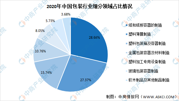 數(shù)據(jù)來(lái)源:中國(guó)包裝聯(lián)合會(huì)、中商產(chǎn)業(yè)研究院整理 根據(jù)中國(guó)包裝聯(lián)合會(huì)2020年數(shù)據(jù),我國(guó)包裝行業(yè)主要分為紙和紙板容器的制造、塑料薄膜的制造、塑料包裝箱及容器制造、金屬包裝容器及材料制造、塑料加工專用設(shè)備制造、玻璃包裝容器制造、軟木制品及其他木制品制造等類。 2020年,紙和紙板容器制品包裝占整個(gè)行業(yè)的28.66%,是包裝行業(yè)最大的細(xì)分領(lǐng)域。