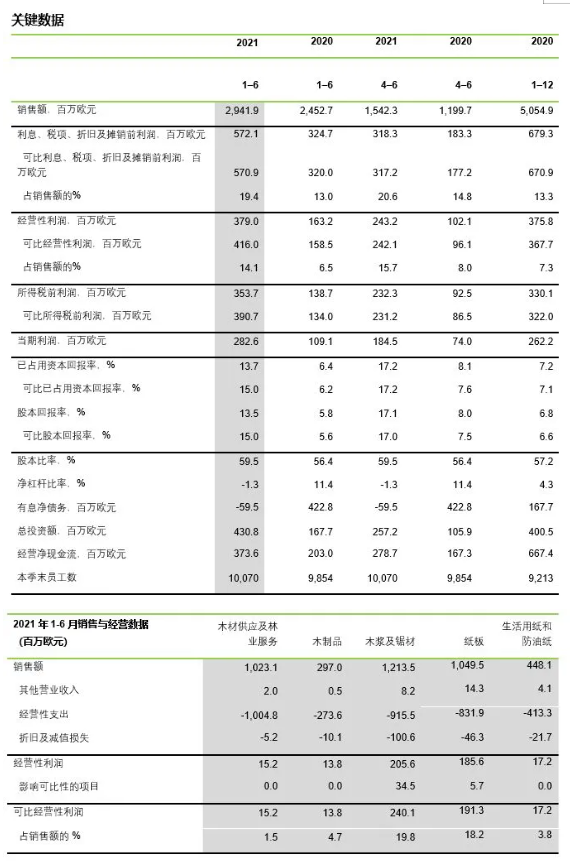 2021年1月-6月(與2020年1-6月相比) 2021年4月-6月(與2020年4-6月相比) 2021年第二季度主要事件 新冠病毒疫情 為阻斷新冠病毒疫情,芬林集團(tuán)在運(yùn)營時(shí)優(yōu)先考慮三大事項(xiàng):員工安全、全員抗疫、業(yè)務(wù)持續(xù)。芬林集團(tuán)嚴(yán)格遵守有關(guān)部門發(fā)布的新冠病毒防疫指南。把盡量減少身體接觸作為最重要的預(yù)防措施。 在疫情期間,芬林集團(tuán)的資源保障保持正常狀態(tài)。除少數(shù)例外情況,生產(chǎn)和交付一直運(yùn)轉(zhuǎn)正常。 7月以來發(fā)生的事件 胡蘇姆木漿廠于7月份做出一項(xiàng)重大投資決定,將折疊紙板的年產(chǎn)能提高20萬噸。該項(xiàng)目投資額約為2.1億歐元,鞏固了芬林紙板作為歐洲折疊紙板領(lǐng)先生產(chǎn)商的地位。結(jié)合胡蘇姆一體化工廠計(jì)劃內(nèi)的年度維護(hù)停工檢修,工程建設(shè)將于2021年10月開始前期工作。預(yù)計(jì)新增產(chǎn)能將于2023年秋季開始爬升,并于2025年底達(dá)到滿額。新增產(chǎn)能將主要投向北美和歐洲市場,預(yù)計(jì)這兩塊市場對芬林紙板的紙板需求將保持增長。芬林紙板于2021年7月至9月的經(jīng)營性利潤將計(jì)入的與紙機(jī)有關(guān)的資產(chǎn)減值損失約500萬歐元,該項(xiàng)目在財(cái)報(bào)中將對可比性利潤產(chǎn)生影響。 2021年7-9月的利潤預(yù)測 芬林集團(tuán)預(yù)計(jì)2021年7-9月的可比經(jīng)營性利潤將高于2021年4-6月。 芬林集團(tuán)總裁兼首席執(zhí)行官何亦凱: “芬林集團(tuán)在2021年上半年交出了一份亮眼的答卷。木漿和木材產(chǎn)品于2020年第四季度出現(xiàn)需求和價(jià)格雙增長,并且一直貫穿整個(gè)2021年上半年。紙板業(yè)務(wù)也維持強(qiáng)勁表現(xiàn),本就穩(wěn)健的需求仍持續(xù)增長,導(dǎo)致各大市場的價(jià)格水平亦向上揚(yáng)。生活用紙消費(fèi)品的需求量顯著低于去年水平,疫情的間歇性緩解并未對專業(yè)產(chǎn)品(商用系列)的需求產(chǎn)生較大影響。 芬林集團(tuán)于2019-2020年度在芬蘭勞馬、瑞典胡蘇姆和芬蘭凱米啟動(dòng)了重大投資項(xiàng)目。這些項(xiàng)目正按計(jì)劃推進(jìn),將于2022年和2023年開始投產(chǎn)。建筑業(yè)回暖,再加上鋼材價(jià)格的急劇攀升,給上述項(xiàng)目帶來了成本壓力。 胡蘇姆木漿廠于7月份做出一項(xiàng)重大投資決定,將折疊紙板的年產(chǎn)能提高20萬噸。芬林集團(tuán)將繼續(xù)發(fā)展核心業(yè)務(wù),包括瑞典瑪麗斯塔德生活用紙廠的前期規(guī)劃,以及將在艾內(nèi)科斯基工廠實(shí)施的木材產(chǎn)品加工發(fā)展計(jì)劃。預(yù)計(jì)相關(guān)投資決策最早在2022年進(jìn)入實(shí)際落實(shí)階段,屆時(shí)項(xiàng)目的環(huán)境許可證和詳細(xì)規(guī)劃也將獲批完成。 芬林之春繼續(xù)致力于開發(fā)新的林業(yè)商機(jī)。自該創(chuàng)新公司成立以來,沿著從原材料到產(chǎn)品的產(chǎn)業(yè)價(jià)值鏈,我們已投資了五個(gè)相關(guān)項(xiàng)目。這些項(xiàng)目旨在借助新業(yè)務(wù)創(chuàng)造新價(jià)值,與芬林集團(tuán)堅(jiān)實(shí)的基礎(chǔ)業(yè)務(wù)單元并駕齊驅(qū)。 芬林之春投資的最大兩個(gè)項(xiàng)目均位于芬蘭艾內(nèi)科斯基,一家是已經(jīng)投入運(yùn)營的紡織纖維示范工廠,另外一家是將于今年下半年竣工的3D纖維包裝示范工廠。 氣候變化和生物多樣性的喪失正日益成為全球性問題,制定所有決策時(shí)都必須考慮到如何應(yīng)對這些挑戰(zhàn)。芬蘭森林作為可再生原材料的主要來源,支持全球市場對林紙產(chǎn)品的需求。我們?yōu)闈M足人們的日常生活和健康而生產(chǎn)產(chǎn)品。在產(chǎn)品生產(chǎn)過程中必須高效利用原材料,杜絕浪費(fèi),同時(shí)不使用化石燃料。這需要依靠我們在行業(yè)中的長期發(fā)展和不斷投入。 林業(yè)運(yùn)營應(yīng)著眼長遠(yuǎn)發(fā)展,不僅要提高木材產(chǎn)量,提升碳結(jié)合力,同時(shí)要采用科學(xué)的方法,以更好地保護(hù)生物多樣性。我們需要采取更多措施來保護(hù)寶貴的森林生態(tài)系統(tǒng),不斷改進(jìn)和完善商用林的木材加工方法,實(shí)現(xiàn)經(jīng)濟(jì)和生態(tài)效益雙豐收。歐盟在制定相關(guān)法規(guī)和戰(zhàn)略時(shí),以及各國在做出相關(guān)決策時(shí),都應(yīng)考慮到整個(gè)森林產(chǎn)業(yè)價(jià)值鏈對氣候和環(huán)境問題以及國家經(jīng)濟(jì)的重要性。我們愿意為行業(yè)發(fā)展貢獻(xiàn)力量。這個(gè)行業(yè)需要一個(gè)可預(yù)知的穩(wěn)定的經(jīng)營環(huán)境。"
