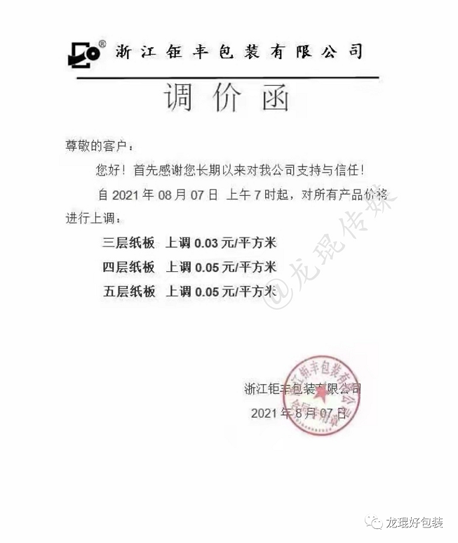浙江鉅豐包裝有限公司 從8月7日上午7點開始,三層紙板上調0.03元/平方,四層紙板上調0.05元/平方,五層紙板上調0.05元/平方。