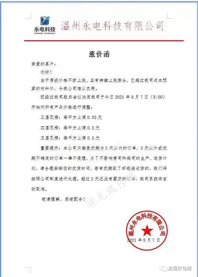 溫州永電科技有限公司 從8月7日開始,三層瓦楞上調0.03元/平方,四層瓦楞上調0.5元/平方,五層紙板上調0.5元/平方。