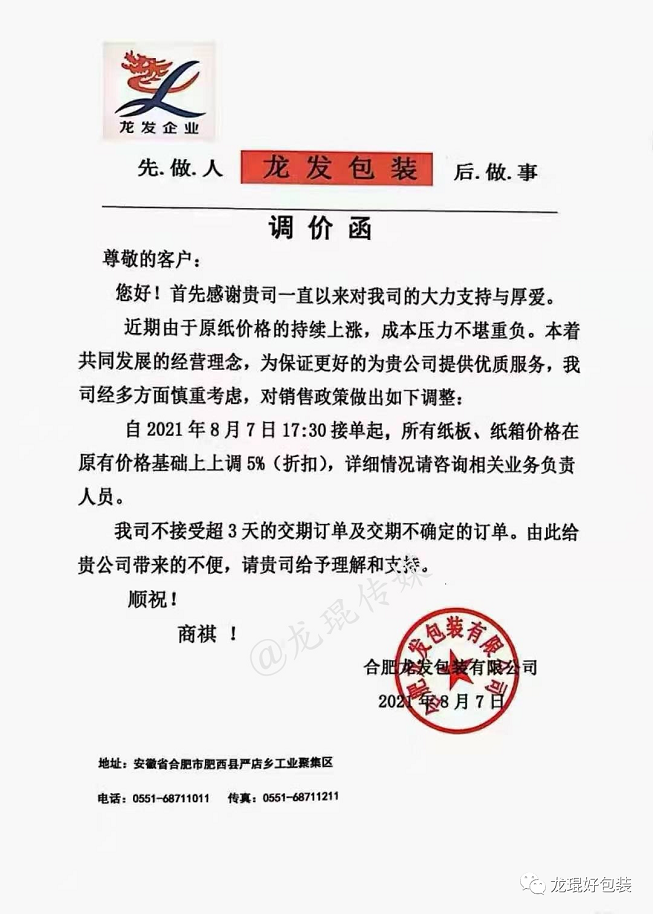 合肥龍發包裝有限公司 從8月7日17點半接單起,所有紙板、紙箱價格在原有價格基礎上上調5%(折扣)。