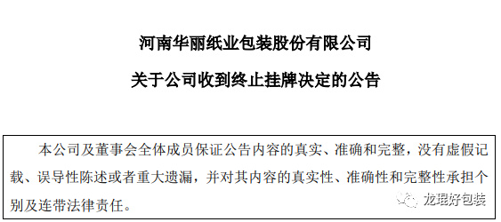 8月13日,河南華麗紙業包裝股份有限公司發布公告稱,公司已收到全國中小企業股份轉讓系統有限責任公司出具的《關于終止河南華麗紙業包裝股份有限公司股票掛牌的決定》。