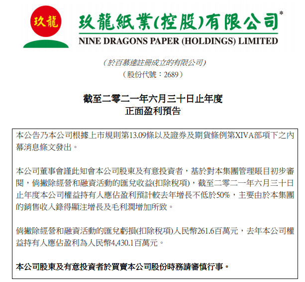 8月23日午間,玖龍紙業(yè)發(fā)布公告稱,基于對(duì)集團(tuán)管理賬目初步審閱,倘撇除經(jīng)營(yíng)和融資活動(dòng)的匯兌收益(扣除稅項(xiàng)),截至2021年6月30日止年度公司權(quán)益持有人應(yīng)占盈利預(yù)計(jì)較截至2020年6月30日止年度增長(zhǎng)不低于50%,主要由于集團(tuán)的銷售收入錄得顯注增長(zhǎng)及毛利潤(rùn)增加所致。