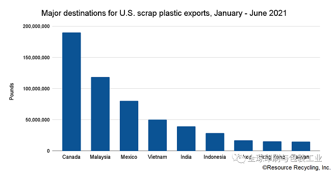 今年上半年其他主要進口國包括墨西哥(110萬噸)、泰國(104萬噸)、越南(102萬噸)、臺灣地區(49萬噸)、加拿大(48.3萬噸)、韓國(40.3萬噸)、馬來西亞(39萬噸)和印度尼西亞(32.6萬噸)。就泰國而言,其在2021年上半年自美國進口的廢紙比2020年同期進口的28.8萬噸增加了260%。這些國家的增長正在緩和中國廢紙進口禁令的影響,這給全球廢紙出口市場留下了一個巨大的缺口。 與2017年上半年的出口相比,2021年美國廢紙總出口量下降了12%。2017年,中國進口的廢紙占美國所有廢紙出口總量的66%,而今年同期,中國進口的廢紙占美國廢紙出口的3%。 來自美國的廢紙紙漿出口也在繼續。這是一種相對較新的商業模式,其中廢紙在美國予以回收和制漿,然后運往其他地方進行最終產品制造。2021年上半年,美國出口商出口了20.5萬噸由廢紙制成的紙漿,與去年同期出口的20.3萬噸持平。出口市場主要集中在中國,占美國廢紙紙漿出口總量的83%,加拿大占12%。 另外,今年上半年,美國公司出口的回收塑料略多于2020年同期。從1-6月,出口商出口了6.438億磅廢塑料,略高于一年前出口的6.416億磅。加拿大是最大的塑料進口國。該國進口了1.901億磅廢塑料,占美國所有材料出口的近30%,這也創造了自2016年以來上半年的塑料進口最高水平。 鑒于巴塞爾公約監管的變化,加拿大和美國政府之間達成了一項協議,以保持向加拿大出口再生塑料的能力,從而增加對加拿大的出口。從廣義上講,巴塞爾公約的變化加強了對廢塑料運輸的監管,并正式關閉了美國向某些國家發送材料的大門。美國不是該公約的締約方,因此禁止締約方與美國進行某些塑料貿易。不過,出口數據顯示美國繼續向巴塞爾締約方國家發送材料。 例如,馬來西亞在今年上半年進口了1.185億磅廢塑料。該國是《巴塞爾公約》的締約方,近年來更加關注塑料廢物進口。從美國出口到馬來西亞的某些類型的廢塑料目前被認為是被禁止的——例如,混合塑料可能屬于禁令范圍。但今年早些時候的一個備受矚目的出口案例清楚地說明了如何解釋規則以及允許哪些材料進入。 在反出口組織標記了2月份從美國運往馬來西亞的塑料貨物后,馬來西亞檢查員攔截了該集裝箱,并在它到達該國時對其進行了檢查。他們報告說,該容器裝有廢聚乙烯,符合該國清潔、分離的廢料進口標準。這將貨物置于禁止其進入該國的巴塞爾公約名稱之外。 1-6月的出口數據顯示,運往馬來西亞的塑料中有67%被指定為聚乙烯。“其他”塑料類別,通常包括混合塑料包、從電子產品中回收的塑料和其他混合材料流,占14%。大多數運往加拿大的塑料被確定為“其他”塑料。