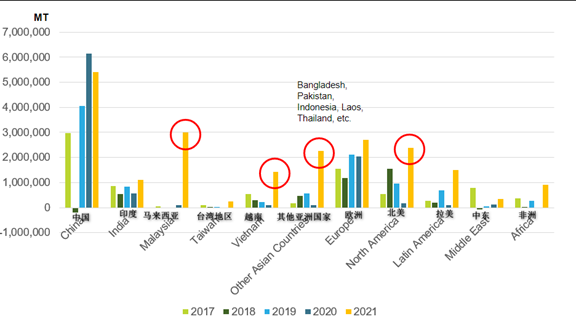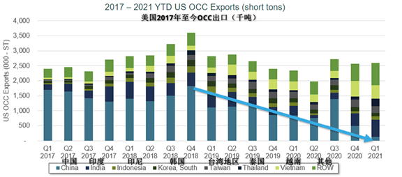 ▲紙和紙板新產能投資 2017年,中國實施了廢紙進口禁令的政策,從而開始影響全球的廢紙進出口市場。這一新政策也開始重塑亞洲、美洲和歐洲的從廢紙回收商到造紙商的整個造紙產業鏈。中國實施這項禁令是為了保護環境資源和公民健康免受由于廢紙質量差而導致的高污染。 因此,廢舊瓦楞紙箱OCC(箱板紙生產中使用的主要類型廢紙)受到嚴重影響,許多中國工廠的進口許可證不符合環境標準并最終被撤銷,大大減少了從美國和歐盟的廢舊瓦楞紙箱OCC進口。2021年初,中國對廢舊瓦楞紙箱OCC進口被全面禁止,影響了各種不同等級紙張的進口總量。廢紙進口的減少增加了其他等級紙張的進口量。 隨著廢紙禁令的發布,中國也開始采取措施消除不必要的和有害的塑料垃圾。 反一次性塑料政策與2021年全面禁止廢紙進口的政策令生產商爭先恐后地使用替代原料——盡管其長期的供應及數量仍然存疑。例如,玖龍宣布新增兩條由安德里茨供應的新BCTMP生產線,包括在其湖北基地用于FBB生產的P-RCAPMP(預處理精煉化學堿性過氧化物機械漿)技術,以及一條維美德提供的CTMP生產線。理文還宣布,安德里茨將為其東莞和九江工廠提供兩條產能分別為1,000admt/d和670admt/d的化學機械纖維生產線,維美德將為其重慶工廠提供一條半化學漿生產線。 另一個例子是福建聯盛,該公司也從維美德訂購了一條BCTMP生產線。所有這些新的纖維生產線都將用于為各種包裝和圖形紙生產線提供紙漿。其主要原材料來源于桉樹、金合歡和楊木木屑以及木材廢料。太陽紙業已經在其瓦楞紙生產中使用了木材廢料。 由于中國OCC禁令和中國制造業的持續搬遷,美國的廢舊瓦楞紙箱OCC出口已由中國轉向東南亞,如下圖所示。費舍爾認為,在全面禁止進口廢紙后,伴隨限塑令的持續影響以及木纖維包裝的興起,中國對市場木漿等紙制品的需求將為行業創造穩定的增長機會。