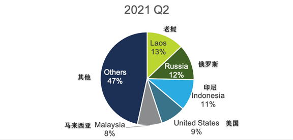 ▲2020年中國紙及紙板進出口情況 與亞洲同行相比,2020年第四季度美國在上海的運輸成本方面處于成本領先地位,成本優勢約為100-150美元/噸。然而,鑒于近期美國和中國之間的運費上漲可能高達200%,成本優勢在很大程度上受到侵蝕。當入研究對中國市場的箱板紙出口的細節時,我們可以看到,美國在2021年第二季度失去了對其他國家的第二大供應商地位,自2020年以來對中國的出口有所下降(下圖)。然而,我們可以有把握地假設,如果運費成本長期繼續保持高位,正如ING所提到的,美國生產商將箱板紙運往中國的盈利機會將會減少。