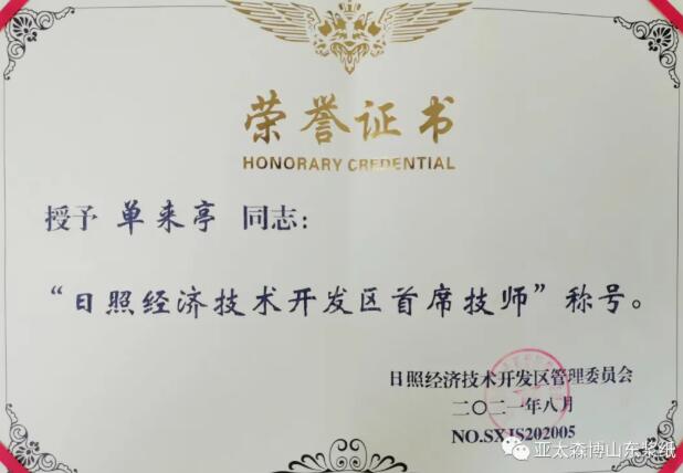 8月17日,日照經濟技術開發區黨政辦公室公布2020年度“日照經濟技術開發區首席技師”名單,公司公共維修部機械維修員單來亭成功入選。