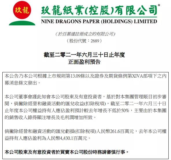 近段時(shí)間,紙包裝業(yè)的上游廠家陸續(xù)發(fā)布半年報(bào),字里行間洋溢著豐收的喜悅。受盈利翻番的帶動(dòng),上市紙企股價(jià)一路走高。正所謂風(fēng)風(fēng)順順,雙喜臨門,好不愜意。 具體來(lái)看一下: 包裝紙板塊 玖龍:盈利增長(zhǎng)不低于50% 8月23日午間,玖龍紙業(yè)發(fā)布公告稱,基于對(duì)集團(tuán)管理賬目初步審閱,倘撇除經(jīng)營(yíng)和融資活動(dòng)的匯兌收益(扣除稅項(xiàng)),截至2021年6月30日止年度公司權(quán)益持有人應(yīng)占盈利預(yù)計(jì)較截至2020年6月30日止年度增長(zhǎng)不低于50%,主要由于集團(tuán)的銷售收入錄得顯注增長(zhǎng)及毛利潤(rùn)增加所致。