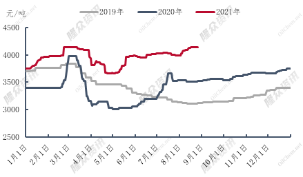 上周五,也就是8月27日,玖龍東莞、泉州基地,聯盛紙業,廣東理文瓦楞紙及箱板紙價格相繼執行優惠政策到月底,執行50-100元/噸的優惠,并通知將于9月1日恢復原價。9月21日為今年的中秋佳節,8月下旬應是瓦楞箱板紙的需求旺季,此時優惠讓利為哪般呢?我們具體分析一下原因。 瓦楞紙價格趨勢分析 2019-2021年瓦楞紙價格走勢圖↓