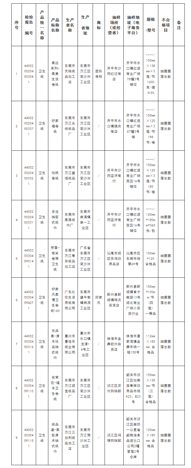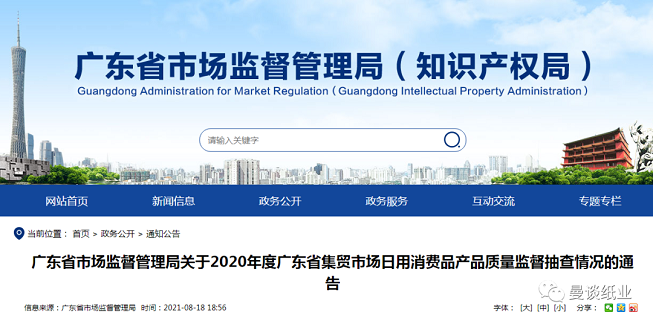 2021年8月18日,廣東省市場監督管理局網站發布2020年度廣東省集貿市場日用消費品產品質量監督抽查情況。本次共對130家企業生產的247款衛生用紙制品產品質量開展了監督抽查。經檢驗,發現9家企業生產的9款產品不合格。
