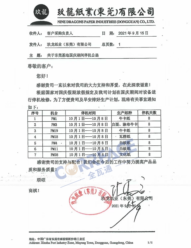 停機公函中提到,停機的紙機中包括: 文化紙機PM28 灰底白板紙機PM4和PM11 ?垯CPM1和PM19 瓦楞紙機PM18 白面?ê屯坎寂?垯CPM3 東莞玖龍目前共有16臺紙機,合計造紙產能約585萬噸/年,此次停機檢修涉及近半紙機,預計白板紙減產約2萬噸,?、瓦楞紙合計減產約3萬噸。 上周廣東當地另外兩家龍頭紙企發布停機檢修通知: ①廣東理文造紙有限公司9月9日發函宣布停機,由于國廢原料短缺、紙機技術改造等原因,計劃于2021年9月9日至2021年12月31日對PM7、PM9兩條紙機進行停機,本次停機計劃影響紙種主要為PM7--Q紙,PM9--Q紙、B紙。由于停機檢修時間較長,預計停機期間產量損失合計32萬噸上下。 ②東莞金洲紙業有限公司9月9日發布停機改造的通知,鑒于紙機技術改造需要,計劃于2021年9月24日至2021年10月17日對PM4、PM5和PM6進行停機停產,受此影響的紙種分別為Q紙、H紙和T紙。由于停機檢修時間較短,預計停機期間產量損失合計4萬噸上下。 華南地區3家龍頭紙企先后宣布停機檢修計劃,尤其是廣東理文造紙停機時間較長,對當地中短期供應將產生一定影響,紙廠出貨壓力將有所緩解。
