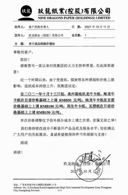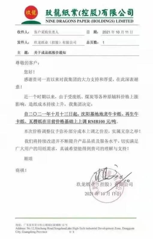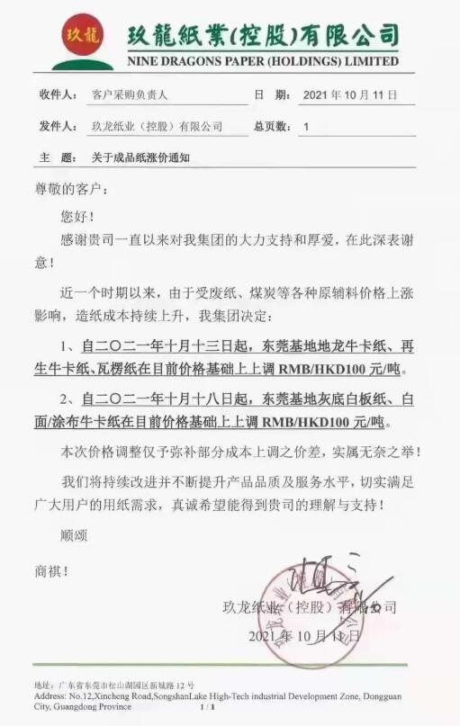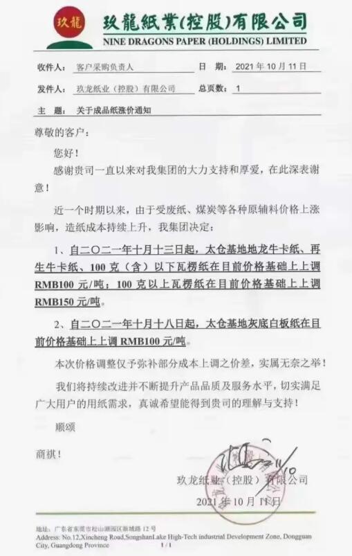 10月11日,就在紙板生產企業繼續調漲之際,玖龍紙業原紙漲價函又已來臨。從各渠道消息來看,本次玖龍紙業旗下東莞、太倉、泉州、天津、重慶、沈陽多個基地均在漲價范圍內,?、瓦楞紙等各類紙種上調50-150元/噸。 玖龍紙業稱,近期以來,廢紙、煤炭等各種原輔料價格上漲,本次價格調整僅予彌補部分成本上調之價差。根據漲價函顯示,玖龍紙業部分生產基地的各類原紙價格將在兩個時間點分別上漲,時間分別為10月13日和10月18日。 玖龍紙業各基地漲價情況 東莞玖龍 自2021年10月13日起,東莞基地地龍?、再生牛卡紙、瓦楞紙在目前價格基礎上上調100元/噸。 自2021年10月18日起,東莞基地灰底白板紙、白面/涂布?堅谀壳皟r格基礎上上調100元/噸。