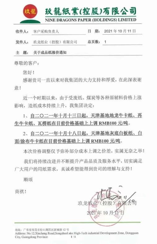 天津玖龍 自2021年10月13日起,天津基地地龍牛卡紙、再生牛卡紙、瓦楞紙在目前價格基礎上上調100元/噸.。 自2021年10月18日起,天津基地灰底白板紙、白面/涂布牛卡紙在目前價格基礎上上調100元/噸.。