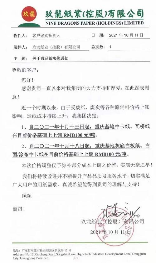 重慶玖龍 自2021年10月13日起,重慶基地牛卡紙、瓦楞紙在目前價格基礎上上調100元/噸.。 自2021年10月18日起,重慶基地灰底白板紙、白面/涂布牛卡紙在目前價格基礎上上調100元/噸.。