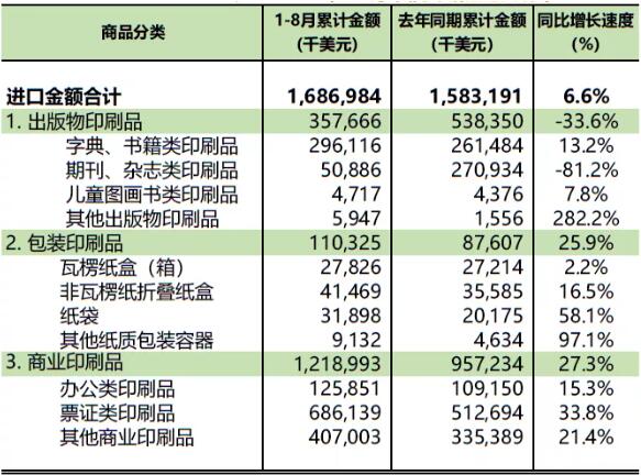 國(guó)內(nèi)印刷品進(jìn)出口概況 2021年1-8月國(guó)內(nèi)印刷品進(jìn)口16.87億美元,同比增長(zhǎng)6.6%(詳見(jiàn)表2)。其中,出版物印刷品進(jìn)口3.58億美元(同比下降33.6%),包裝印刷品進(jìn)口1.10億美元(同比增長(zhǎng)25.9%),商業(yè)印刷品進(jìn)口12.19億美元(同比增長(zhǎng)27.3%)。 相關(guān)印刷品主要子項(xiàng)進(jìn)口,字典書籍類印刷品2.96億美元(同比增長(zhǎng)13.2%),期刊雜志類印刷品5088.6萬(wàn)美元(同比下降81.2%),兒童圖畫書類印刷品471.7萬(wàn)美元(同比增長(zhǎng)7.8%),瓦楞紙盒(箱)2782.6萬(wàn)美元(同比增長(zhǎng)2.2%),非瓦楞紙折疊紙盒4146.9萬(wàn)美元(同比增長(zhǎng)16.5%),紙袋3189.8萬(wàn)美元(同比增長(zhǎng)58.1%),辦公類印刷品1.26億美元(同比增長(zhǎng)15.3%),票證類印刷品6.86億美元(同比增長(zhǎng)33.8%),其他商業(yè)印刷品4.07億美元(同比增長(zhǎng)21.4%)。 表2 2021年1-8月 國(guó)內(nèi)印刷品進(jìn)口統(tǒng)計(jì)