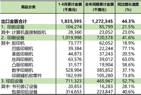 相關(guān)設(shè)備主要子項(xiàng)進(jìn)口,計(jì)算機(jī)直接制版機(jī)1201.0萬(wàn)美元(同比增長(zhǎng)56.9%),膠印機(jī)6.26億美元(同比增長(zhǎng)64.7%),凹版印刷機(jī)1235.2萬(wàn)美元(同比增長(zhǎng)40.5%),柔版印刷機(jī)1643.4萬(wàn)美元(同比下降38.4%),絲網(wǎng)印刷機(jī)3974.8萬(wàn)美元(同比下降1.6%),凸版印刷機(jī)330.9萬(wàn)美元(同比增長(zhǎng)242.5%),數(shù)字印刷機(jī)1.65億美元(同比增長(zhǎng)22.2%),印刷輔機(jī)和零件6.00億美元(同比增長(zhǎng)85.1%),書刊裝訂設(shè)備5913.9萬(wàn)美元(同比增長(zhǎng)48.0%),包裝印后設(shè)備3755.7萬(wàn)美元(同比增長(zhǎng)65.9%)。 同期,國(guó)內(nèi)印刷裝備出口18.36億美元,較去年同期增長(zhǎng)44.3%(詳見(jiàn)表5)。其中,印前設(shè)備出口1.04億美元(同比增長(zhǎng)21.5%),印刷設(shè)備出口10.20億美元(同比增長(zhǎng)41.6%),印后設(shè)備出口7.11億美元(同比增長(zhǎng)52.7%)。 表5 2021年1-8月 國(guó)內(nèi)印刷裝備出口統(tǒng)計(jì)