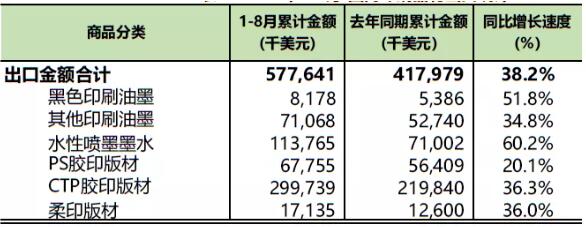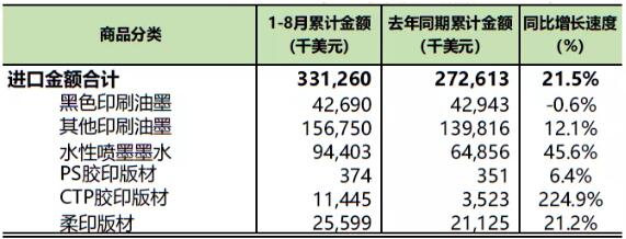 相關(guān)設(shè)備主要子項(xiàng)出口,計(jì)算機(jī)直接制版機(jī)2836.0萬(wàn)美元(同比增長(zhǎng)23.0%),膠印機(jī)7377.7萬(wàn)美元(同比增長(zhǎng)18.9%),凹版印刷機(jī)3938.4萬(wàn)美元(同比增長(zhǎng)77.1%),柔版印刷機(jī)4487.3萬(wàn)美元(同比增長(zhǎng)20.5%),絲網(wǎng)印刷機(jī)6357.6萬(wàn)美元(同比增長(zhǎng)63.0%),凸版印刷機(jī)3157.7萬(wàn)美元(同比增長(zhǎng)58.6%),數(shù)字印刷機(jī)5.29億美元(同比增長(zhǎng)37.1%),印刷輔機(jī)和零件1.83億美元(同比增長(zhǎng)73.8%),書刊裝訂設(shè)備2085.3萬(wàn)美元(同比增長(zhǎng)28.1%),包裝印后設(shè)備3.15億美元(同比增長(zhǎng)40.6%)。 同期,國(guó)內(nèi)印刷裝備進(jìn)出口貿(mào)易順差1.58億美元(同比下降23.8%)。 國(guó)內(nèi)印刷器材進(jìn)出口概況 2021年1-8月國(guó)內(nèi)印刷器材進(jìn)口3.31億美元,同比增長(zhǎng)21.5%(詳見(jiàn)表6)。其中,黑色印刷油墨1262.67噸、4269.0萬(wàn)美元(同比下降0.6%),其他印刷油墨5883.12噸、1.57億美元(同比增長(zhǎng)12.1%),水性噴墨墨水4880.88噸、9440.3萬(wàn)美元(同比增長(zhǎng)45.6%),PS膠印版材1.74萬(wàn)平方米、37.4萬(wàn)美元(同比增長(zhǎng)6.4%),CTP膠印版材271.62萬(wàn)平方米、1144.5萬(wàn)美元(同比增長(zhǎng)224.9%),柔印版材47.33萬(wàn)平方米、2559.9萬(wàn)美元(與上年增長(zhǎng)21.2%)。 表6 2021年1-8月 國(guó)內(nèi)印刷器材進(jìn)口統(tǒng)計(jì)