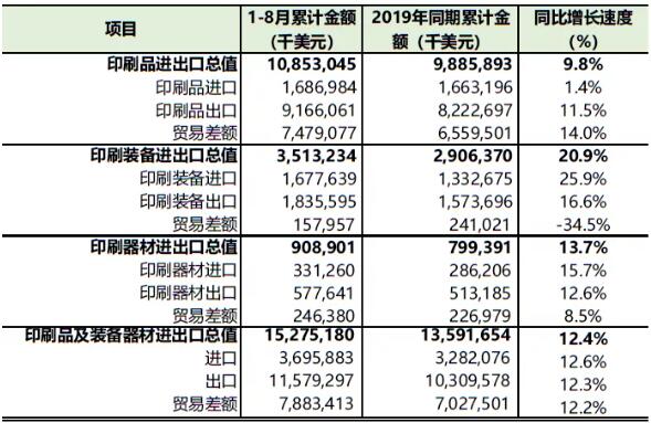 同期,國(guó)內(nèi)印刷器材進(jìn)出口貿(mào)易順差2.46億美元(同比增長(zhǎng)69.5%)。 本期觀察 總結(jié): 2021年1-8月國(guó)內(nèi)印刷產(chǎn)業(yè)相關(guān)商品進(jìn)出口總值持續(xù)保持增長(zhǎng)。與去年同期相比,本期國(guó)內(nèi)印刷品、印刷裝備、印刷器材的進(jìn)出口規(guī)模均已超過(guò)去年同期水平。其中,印刷裝備表現(xiàn)尤為突出(同比增長(zhǎng)50.3%),而印刷器材也表現(xiàn)不俗(同比增長(zhǎng)31.6%),印刷品則表現(xiàn)相對(duì)平緩(同比增長(zhǎng)6.9%)。 本期國(guó)內(nèi)印刷品、印刷裝備、印刷器材進(jìn)口、出口增長(zhǎng)較快的前五位商品類別如下: 進(jìn)口:其他出版物印刷品(+282.2%)、凸版印刷機(jī)(+242.5%)、CTP膠印版材(+224.9%)、其他紙質(zhì)包裝容器(+97.1%)、印刷輔機(jī)和零件(+85.1%); 出口:票證類印刷品(+180.9%)、凹印機(jī)(+77.1%)、印刷輔機(jī)和零件(+73.8%)、絲印機(jī)(+63.0%)、水性噴墨墨水(+60.2%)。 本期,國(guó)內(nèi)印刷品、印刷裝備、印刷器材進(jìn)出口相對(duì)萎縮的商品類別如下: 進(jìn)口:期刊雜志類印刷品(-81.2%)、柔版印刷機(jī)(-38.4%); 出口:其他商業(yè)類印刷品(-36.5%)、辦公類印刷品(-5.5%)。 如果說(shuō)2020年同期國(guó)內(nèi)印刷產(chǎn)業(yè)正處于遭受疫情沖擊后的復(fù)工復(fù)產(chǎn)期,相關(guān)商品的進(jìn)出口處于低谷,用今年的數(shù)據(jù)與之對(duì)比會(huì)有較大的差距(詳見(jiàn)表8),那么,本期數(shù)據(jù)與新冠肺炎疫情暴發(fā)前的數(shù)據(jù)(2019年1-8月)相比又會(huì)如何呢? 印刷品進(jìn)口增長(zhǎng)1.4%,出口增長(zhǎng)11.5%; 印刷裝備進(jìn)口增長(zhǎng)25.9%,出口增長(zhǎng)16.6%; 印刷器材進(jìn)口增長(zhǎng)15.6%,出口增長(zhǎng)12.6%。 上述對(duì)比數(shù)據(jù)表明,截至2021年8月,國(guó)內(nèi)印刷產(chǎn)業(yè)相關(guān)商品的進(jìn)出口貿(mào)易規(guī)模已經(jīng)全面恢復(fù)到了疫前水平,而且多數(shù)商品的進(jìn)出口規(guī)模還有了一定幅度的增長(zhǎng)。 表8 2021/2019年1-8月國(guó)內(nèi)國(guó)內(nèi)印刷品及印刷裝備器材進(jìn)出口對(duì)比