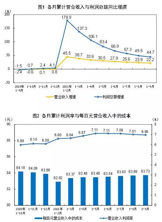 10月27日,國家統計局發布2021年1~9月份全國規模以上工業企業利潤情況。1—9月份,全國規模以上工業企業實現利潤總額63440.8億元,同比增長44.7%,比2019年1—9月份增長41.2%,兩年平均增長18.8%。 1—9月份,規模以上工業企業中,國有控股企業實現利潤總額19850.5億元,同比增長77.9%;股份制企業實現利潤總額45209.0億元,增長50.5%;外商及港澳臺商投資企業實現利潤總額16978.0億元,增長31.7%;私營企業實現利潤總額18606.3億元,增長30.7%。 1—9月份,采礦業實現利潤總額7006.9億元,同比增長1.62倍;制造業實現利潤總額52986.4億元,增長42.9%;電力、熱力、燃氣及水生產和供應業實現利潤總額3447.5億元,下降15.2%。