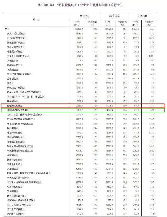 1—9月份,在41個工業大類行業中,35個行業利潤總額同比增長,1個行業扭虧為盈, 5個行業下降。主要行業利潤情況如下:石油、煤炭及其他燃料加工業利潤總額同比增長9.30倍,石油和天然氣開采業增長2.67倍,煤炭開采和洗選業增長1.72倍,有色金屬冶煉和壓延加工業增長1.62倍,黑色金屬冶煉和壓延加工業增長1.45倍,化學原料和化學制品制造業增長1.27倍,計算機、通信和其他電子設備制造業增長38.7%,通用設備制造業增長17.9%,專用設備制造業增長17.8%,電氣機械和器材制造業增長16.0%,非金屬礦物制品業增長14.7%,紡織業增長1.4%,汽車制造業增長1.2%,農副食品加工業下降7.1%,電力、熱力生產和供應業下降24.6%。 值得關注的是,造紙和紙制品業實現利潤總額648.4億元,同比增長34.4%;印刷和記錄媒介復制業實現利潤總額273.9億元,同比下降0.6%。