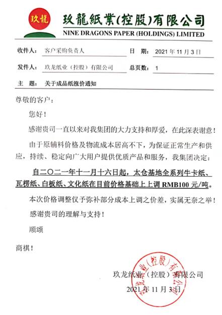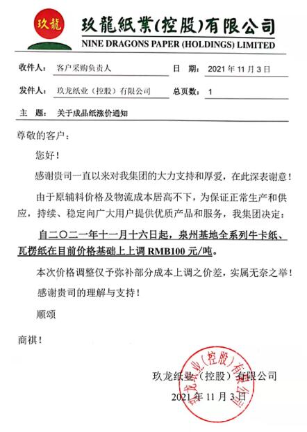 11月1日,玖龍紙業各基地紙種全線上漲,落實此前宣布的100-150元/噸的漲幅。時隔兩日后,玖龍紙業又發出新的漲價函,旗下各大基地將從11月16日起100元/噸。這將是玖龍紙業在11月份的第二輪漲價,也是自9月底以來的第七輪上調。 東莞玖龍 自11月16日起,東莞基地全系列牛卡紙(含白面/涂布牛卡)、瓦楞紙、白板紙、文化紙在目前價格基礎上上調漲價100元/噸。