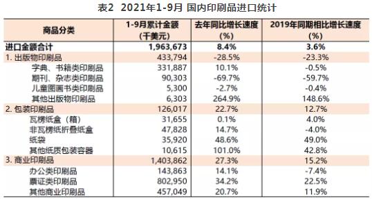 國內印刷品進出口概況 2021年1-9月國內印刷品進口19.64億美元(詳見表2),同比增長8.4%比2019年同期增長3.6%。其中,出版物印刷品進口4.34億美元(同比下降28.5%、比2019年同期下降23.3%)、包裝印刷品進口1.26億美元(同比增長22.7%、比2019年同期增長12.7%)、商業印刷品進口14.04美元(同比增長27.3%、比2019年同期增長15.2%)。 相關印刷品主要子項進口,字典書籍類印刷品3.32億美元(同比增長10.1%、比2019年同期下降0.5%)、期刊雜志類印刷品9030.3萬美元(同比下降69.7%、比2019年同期下降59.7%)、兒童圖畫書類印刷品530.0萬美元(同比下降2.7%、比2019年同期下降0.4%)、瓦楞紙盒(箱)3165.5萬美元(同比增長0.1%、比2019年同期增長4.0%)、非瓦楞紙折疊紙盒4782.8美元(同比增長14.7%、比2019年同期下降4.0%)、紙袋3592.0萬美元(同比增長48.6%、比2019年同期增長49.0%)、辦公類印刷品1.44億美元(同比增長14.1%、比2019年同期下降7.4%)、票證類印刷品8.03億美元(同比增長34.2%、比2019年同期增長22.5%)、其他商業印刷品4.57億美元(同比增長20.7%、比2019年同期增長11.9%)。 表2 2021年1-9月 國內印刷品進口統計