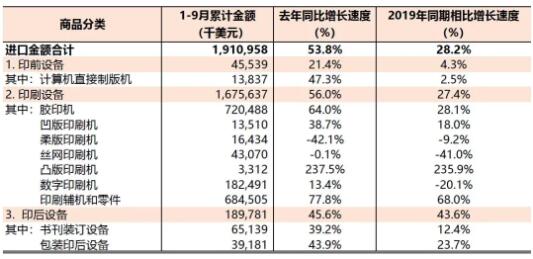 相關印刷品主要子項出口,字典書籍類印刷品8.47億美元(同比增長27.4%、比2019年同期下降3.0%)、期刊雜志類印刷品565.6萬美元(同比增長31.1%、比2019年同期下降25.9%)、兒童圖畫書類印刷品5.88億美元(同比增長21.4%、比2019年同期增長17.0%)、瓦楞紙盒(箱)13.83億美元(同比增長31.7%、比2019年同期增長54.8%)、非瓦楞紙折疊紙盒15.95億美元(同比增長42.0%、比2019年同期增長50.3%)、紙袋12.18億美元(同比增長37.2%、比2019年同期增長11.6%)、辦公類印刷品23.01億美元(同比下降5.0%、比2019年同期下降15.2%)、票證類印刷品8294.5萬美元(同比增長153.5%、比2019年同期增長12.7%)、其他商業印刷品16.63億美元(同比下降31.6%、比2019年同期增長10.2%)。 同期,國內印刷品進出口貿易順差86.70億美元(同比增長8.9%、比2019年同期增長15.9%)。 國內印刷裝備進出口概況 2021年1-9月國內印刷裝備進口19.11億美元(參見表4),與去年同期相比增長53.8%、比2019年同期增長28.2%。其中,印前設備進口0.46億美元(同比增長21.4%、比2019年同期增長4.3%)、印刷設備進口16.76億美元(同比增長56.0%、比2019年同期增長27.4%)、印后設備進口1.90億美元(同比增長45.6%、比2019年同期增長43.6%)。 表4 2021年1-9月 國內印刷裝備進口統計