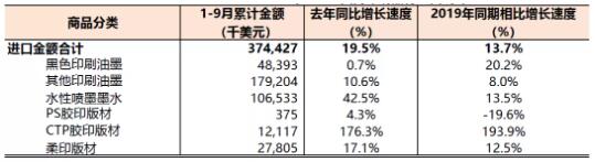 同期,國內印刷裝備出口20.82億美元(詳見表5),較去年同期增長40.8%、比2019年同期增長17.5%。其中,印前設備出口1.21億美元(同比增長22.4%、比2019年同期增長5.7%)、印刷設備出口11.59億美元(同比增長39.0%、比2019年同期增長10.6%)、印后設備出口8.02億美元(同比增長46.9%、比2019年同期增長31.3%)。 相關設備主要子項出口,計算機直接制版機3223.7萬美元(同比增長19.8%、比2019年同期下降24.6%)、膠印機8482.2萬美元(同比增長27.1%、比2019年同期增長19.2%)、凹版印刷機4638.9萬美元(同比增長59.5%、比2019年同期增長13.9%)、柔版印刷機4936.7萬美元(同比增長18.0%、比2019年同期下降8.1%)、絲網印刷機7096.1萬美元(同比增長59.2%、比2019年同期增長13.6%)、凸版印刷機3578.3萬美元(同比增長47.0%、比2019年同期增長8.1%)、數字印刷機5.93億美元(同比增長31.7%、比2019年同期增長3.4%)、印刷輔機和零件2.17億美元(同比增長78.3%、比2019年同期增長46.5%)、書刊裝訂設備2340.5萬美元(同比增長27.1%、比2019年同期下降6.9%)、包裝印后設備3.58億美元(同比增長40.6%、比2019年同期增長45.9%)。 同期,國內印刷裝備進出口貿易順差1.71億美元(同比下降27.7%、比2019年同期下降39.4%)。 國內印刷器材進出口概況 2021年1-9月國內印刷器材進口3.74億美元(參見表6),同比增長19.5%、比2019年同期增長13.7%。其中,黑色印刷油墨1445.64噸、4839.3萬美元(同比增長0.7%、比2019年同期增長20.2%)、其他印刷油墨6706.59噸、1.79億美元(同比增長10.6%、比2019年同期增長8.0%)、水性噴墨墨水5463.23噸、1.07億美元(同比增長42.5%、比2019年同期增長13.5%)、PS膠印版材1.76萬平方米、37.5萬美元(同比增長4.3%、比2019年同期下降19.6%)、CTP膠印版材284.66萬平方米、1211.7萬美元(同比增長176.3%、比2019年同期增長193.9%)、柔印版材51.99萬平方米、2780.5萬美元(與上年增長17.1%、比2019年同期增長12.5%)。 表6 2021年1-9月 國內印刷器材進口統計