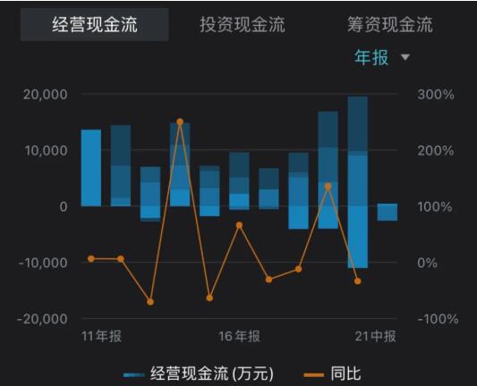 數據來源:Wind 不過,凱恩股份的現金流情況不容樂觀。2017年到2020年,公司經營性現金流凈額三年負增長。至2021年上半年,達到-2157.81萬元。