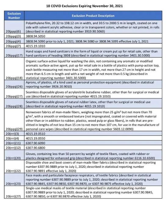這意味著,有18項(xiàng)產(chǎn)品在2021年11月30日排除有效期到期后,將恢復(fù)加征301關(guān)稅,無(wú)法繼續(xù)豁免加征,包括當(dāng)前我國(guó)熱門出口商品——紡織品口罩、部分洗手液、一次性手套等。